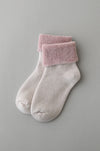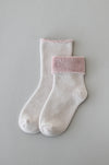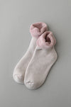 「足の冬着」は、おうち時間にゆったり履いていただきたい靴下。肌にあたる内側はオーガニックコットンのパイル編み、外側はメリノウールで保温性と吸放湿性をプラス。厚みがあり、ゆったりしているので、カバーソックスや お風呂上がり用の靴下としておすすめです。外側はフラットなウール地で外履きも可能です。「足の寝間着」に比べて内側に密着度があるので、また違った使い方ができます。